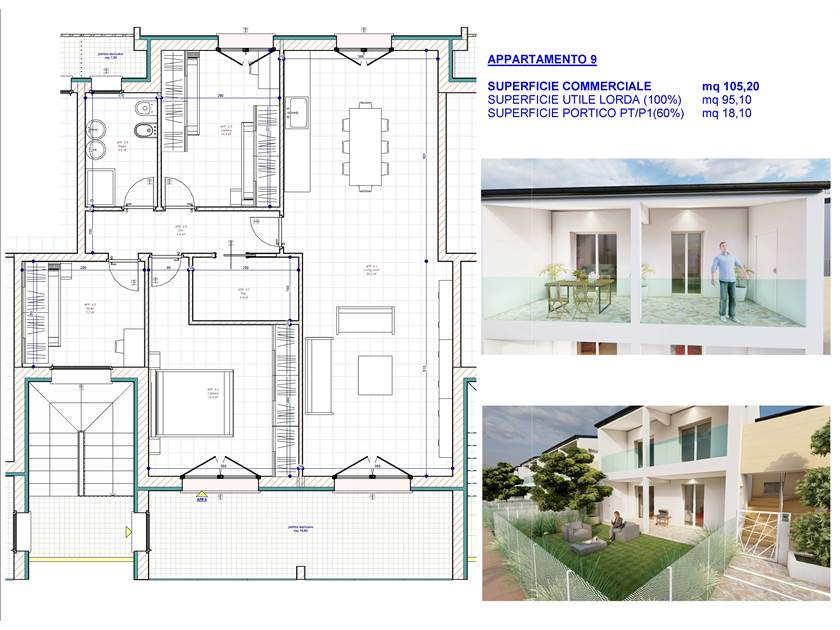 Appartamento al primo e ultimo piano composto da ampio soggiorno-cucina con affaccio su un terrazzo abitabile profondo 212 cm, tre camere, un bagno, un ripostiglio/lavanderia e un posto auto.