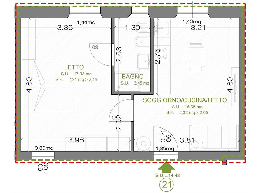 App. 21 - Appartamento al piano primo composto da soggiorno-cucina, una camera, un bagno e un posto auto esterno.